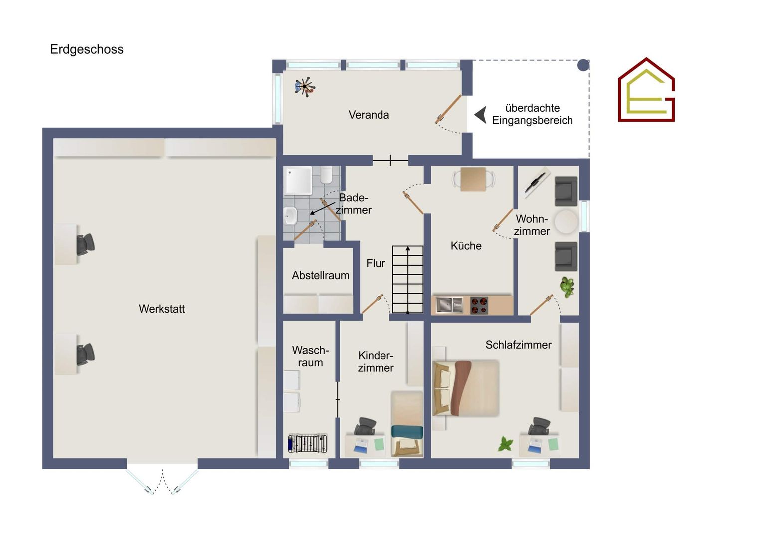 Das Haus selbst verfügt über zwei Zimmer, die sehr flexibel genutzt werden können. Ob als Schlafzimmer, Arbeitszimmer oder Spielzimmer für die Kinder - die Möglichkeiten sind vielfältig. Durch die Kombination aus Wohnen und Gewerbe bietet sich die Möglichkeit, ein Home-Office oder eine kleine Werkstatt zu betreiben, was die Balance zwischen Arbeit und Familie erleichtert.