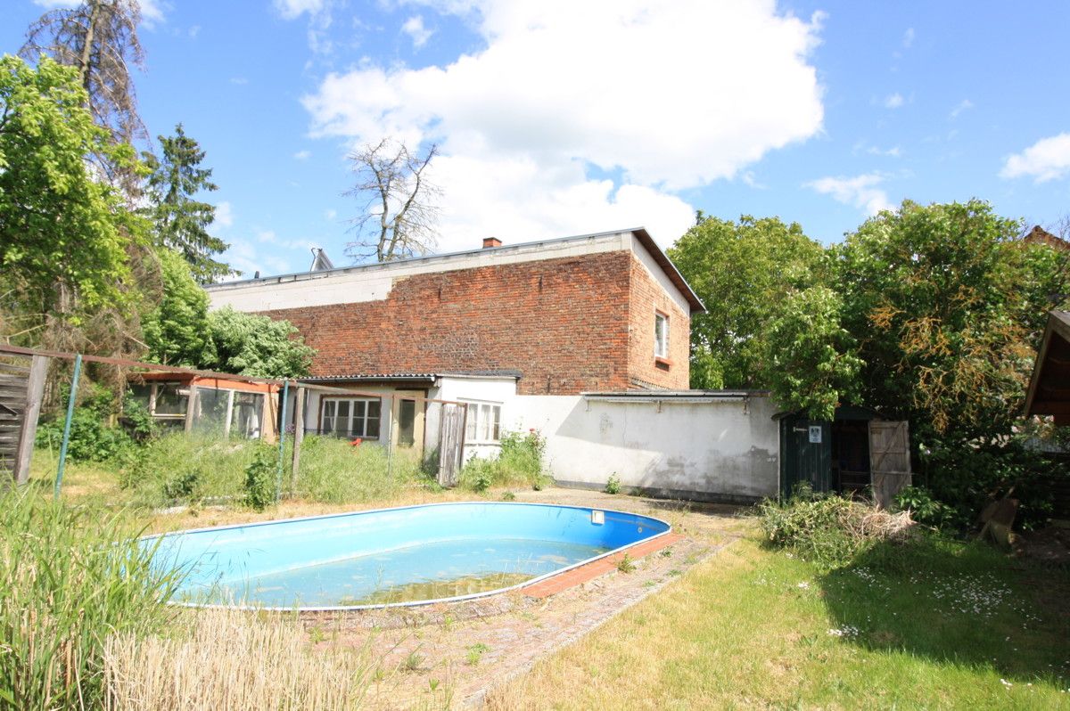 Das Grundstück überzeugt mit einer gepflasterten Terrasse, einem aufgestellten Pool für erfrischende Sommertage und einem schönen Baumbestand, der für angenehme Schattenplätze sorgt. Ein Holzschuppen bietet Platz für Gartengeräte, Sitzmöbel oder Fahrräder.